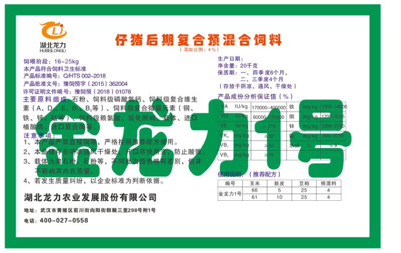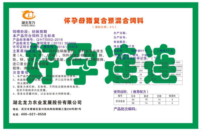 湖北龍力農(nóng)業(yè)發(fā)展股份有限公司坐落于武漢市黃陂區(qū)前川街向陽街群順三里298號附1號。公司成立于2014年6月,公司自成立以來把“創(chuàng)全球最大養(yǎng)豬綜合服務(wù)”為企業(yè)愿景。致力于打造教保料品牌”作為公司發(fā)展的明確目標(biāo)。公司一直致力于豬營養(yǎng)的研究和開發(fā),積極與國內(nèi)外高校和科研機構(gòu)合作,推廣養(yǎng)豬技術(shù)、動物營養(yǎng)新概念,向世界農(nóng)牧企業(yè)學(xué)習(xí)與合作。公司采用國內(nèi)先進的生產(chǎn)工藝,選擇高精度電子配料秤,高均勻度、無殘留混合機等先進設(shè)備....